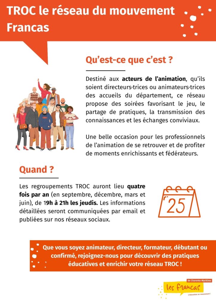 Le réseau, TROC est destiné aux directeurs/trices, aux animateurs/trices et au formateurs/rices des structures adhérentes. Il a pour but d’instaurer des temps de rencontre favorisant l’échange, le partage et la transmission.